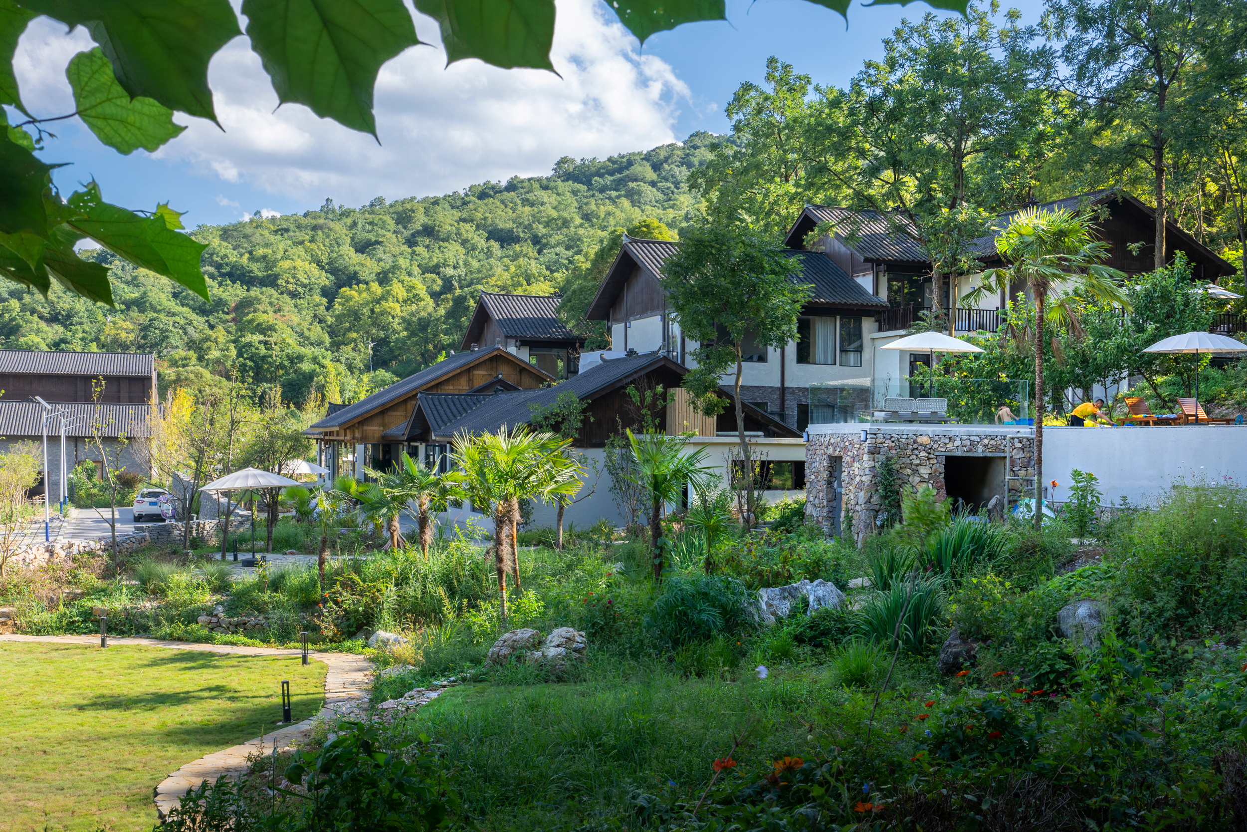 民宿位於拥有600年历史的AAAAA景区青岩古镇,周边有龙井布依古寨、天河潭、夜郎谷、大兴国寺等知名景点,民宿以花溪青岩石板,枫树、椿树等为主要建筑语言,约2000平米建筑,带浴缸及榻榻米的高标客房,一房一景,配套木语书吧、椿悦餐厅、林樾茶园吧、循美匠心空间(非遗技艺馆)、健身房、洗衣房等。项目栖居半山,俯瞰青岩全景,3000平米自然主义花园与大苗山原生植被融为一体,鸟语花香,溪流潺潺,移步异景,野趣山径串联岩上泳池、小流山亭、林下茶园等。 房间以浅咖啡+白色为主色调,搭配定制家俱,每间客房都可观山景,特色榻榻米饮茶区,临窗浴缸,全屋智能,COLMO空调,智能马桶,24小时热水,大投影,迷你吧(免费冰饮)。高品质床品、衞浴、洗护用品、布依特色家居服... 民宿特别设立循美匠心空间(非遗技艺体验),提供包括酱酒品鉴、刺綉蜡染、泥塑陶艺等在地特色民族文化体验。