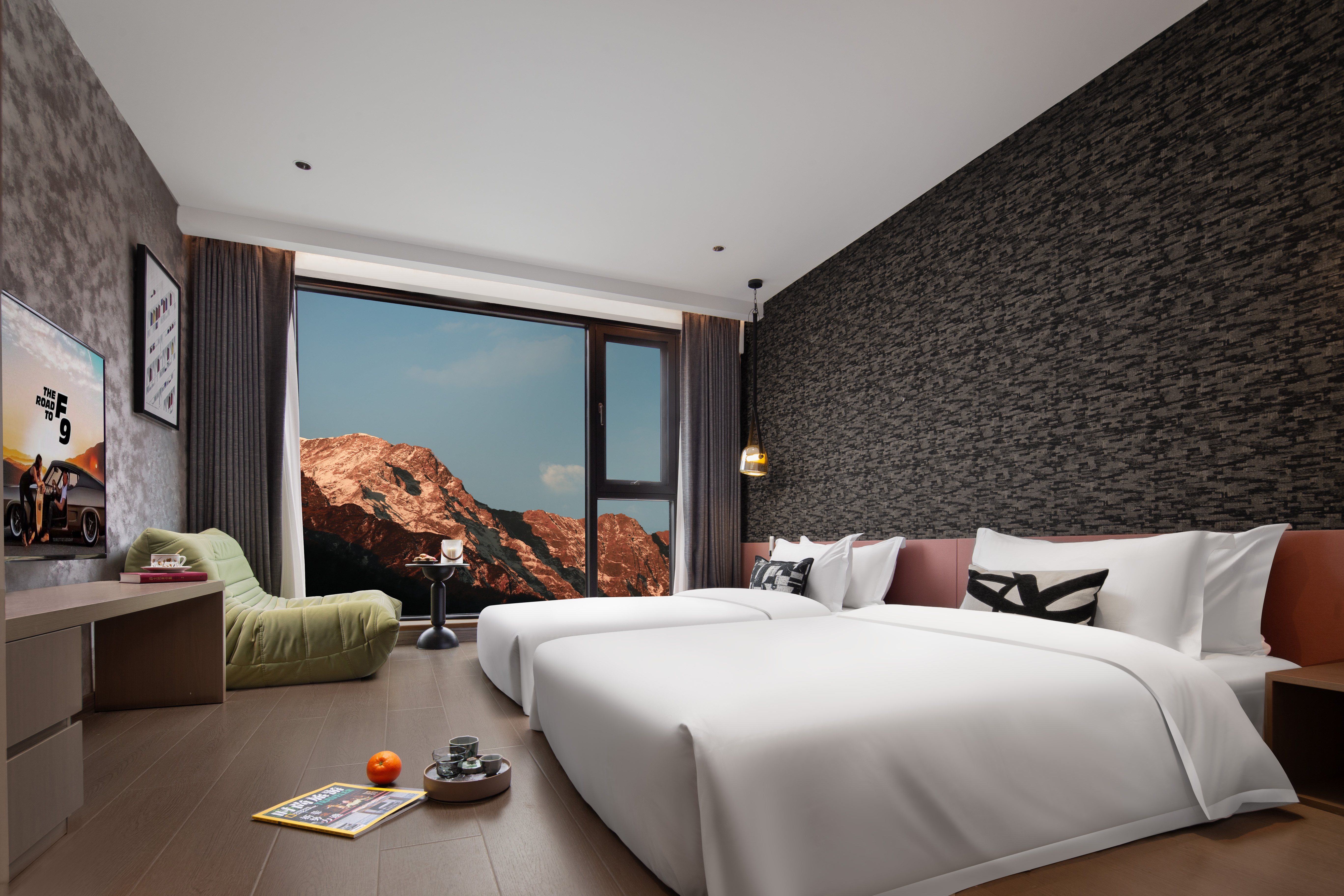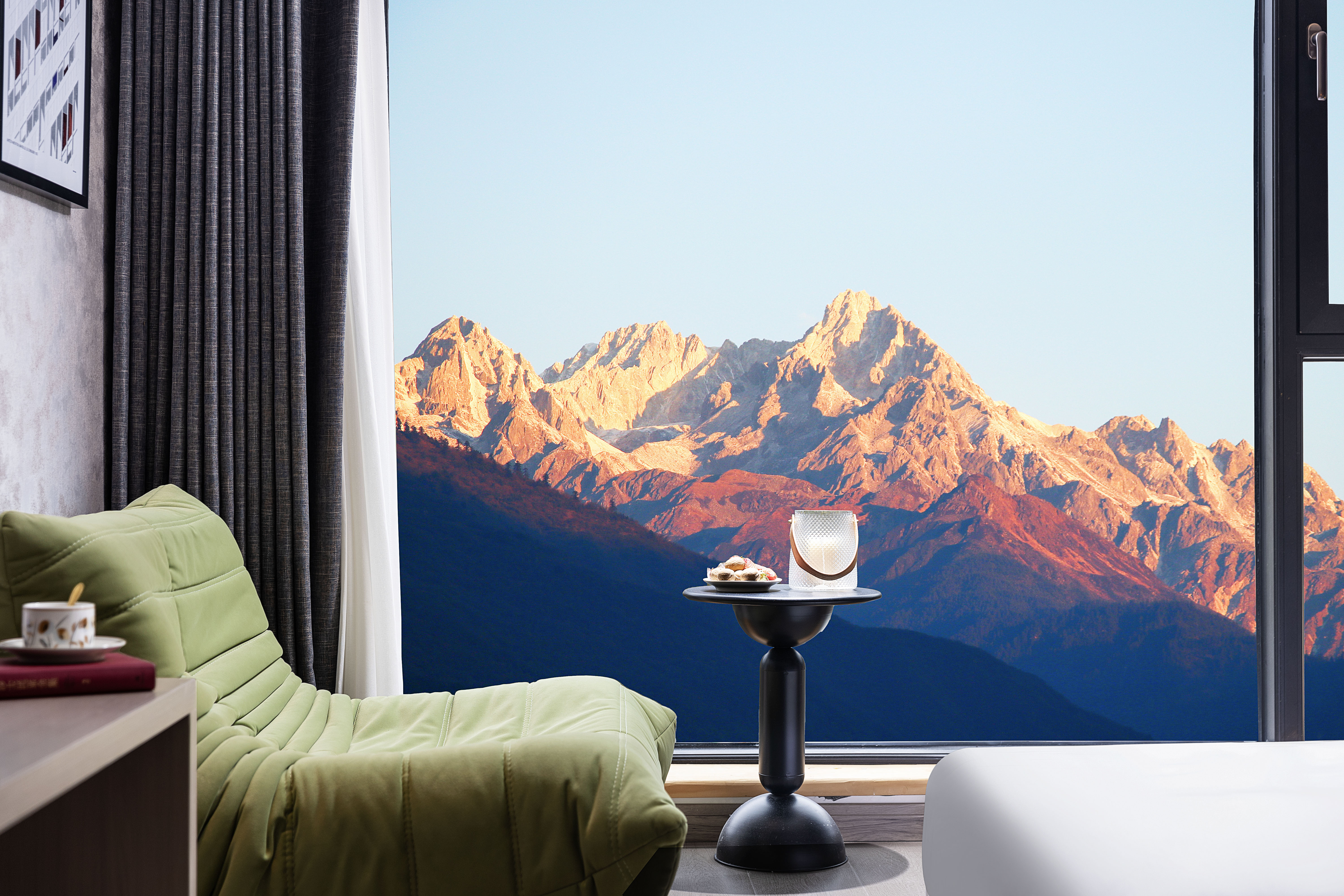 日落山·180°观景榻榻米双床房(观日照金山+享花园冰川温泉+电动窗帘+智能马桶)