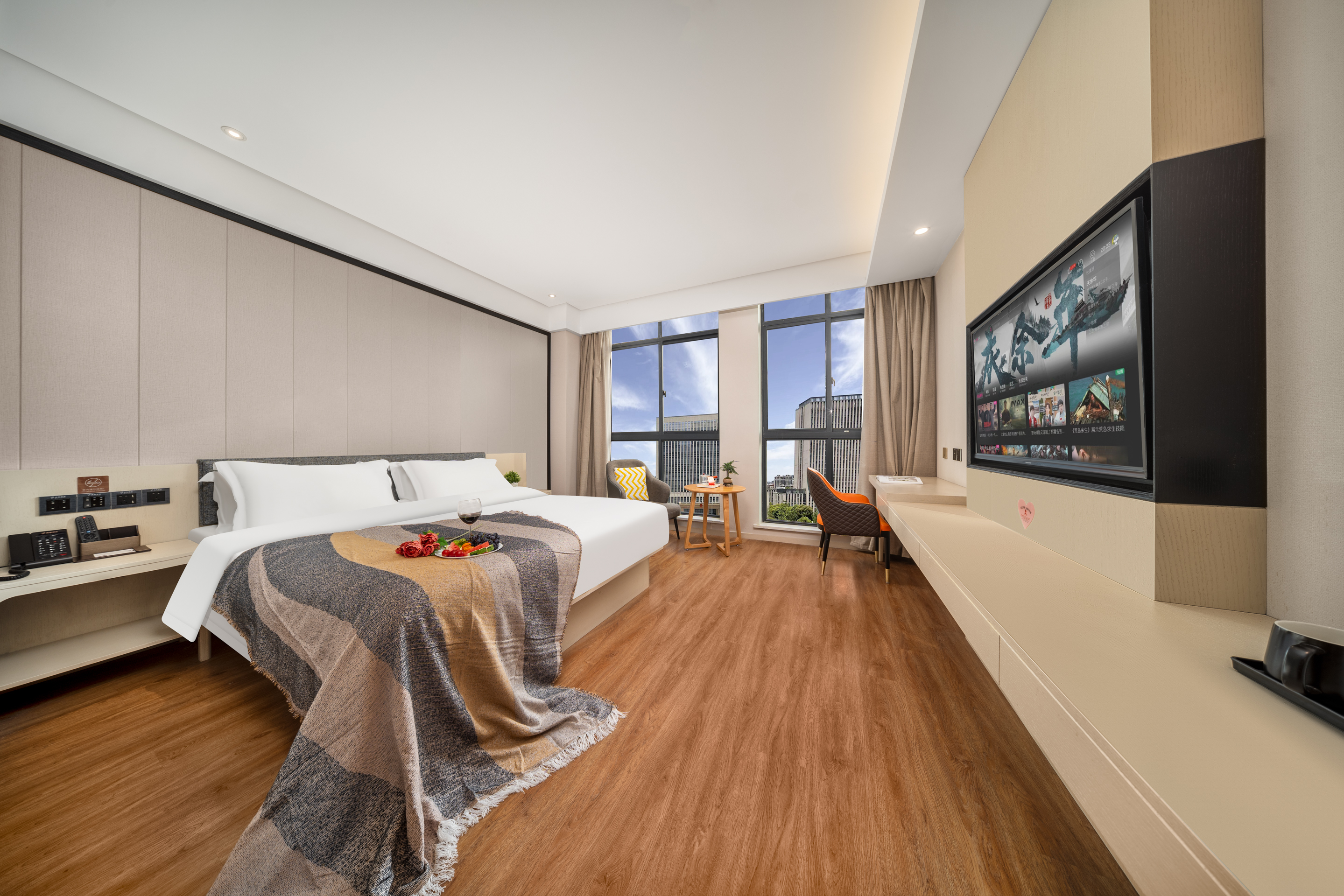Enjoyable Sunshine Double Bed Room (Premium Tea Set + Tea Table + 55-Inch Projector Tv + Latex Mattress + Blackout Curtains)