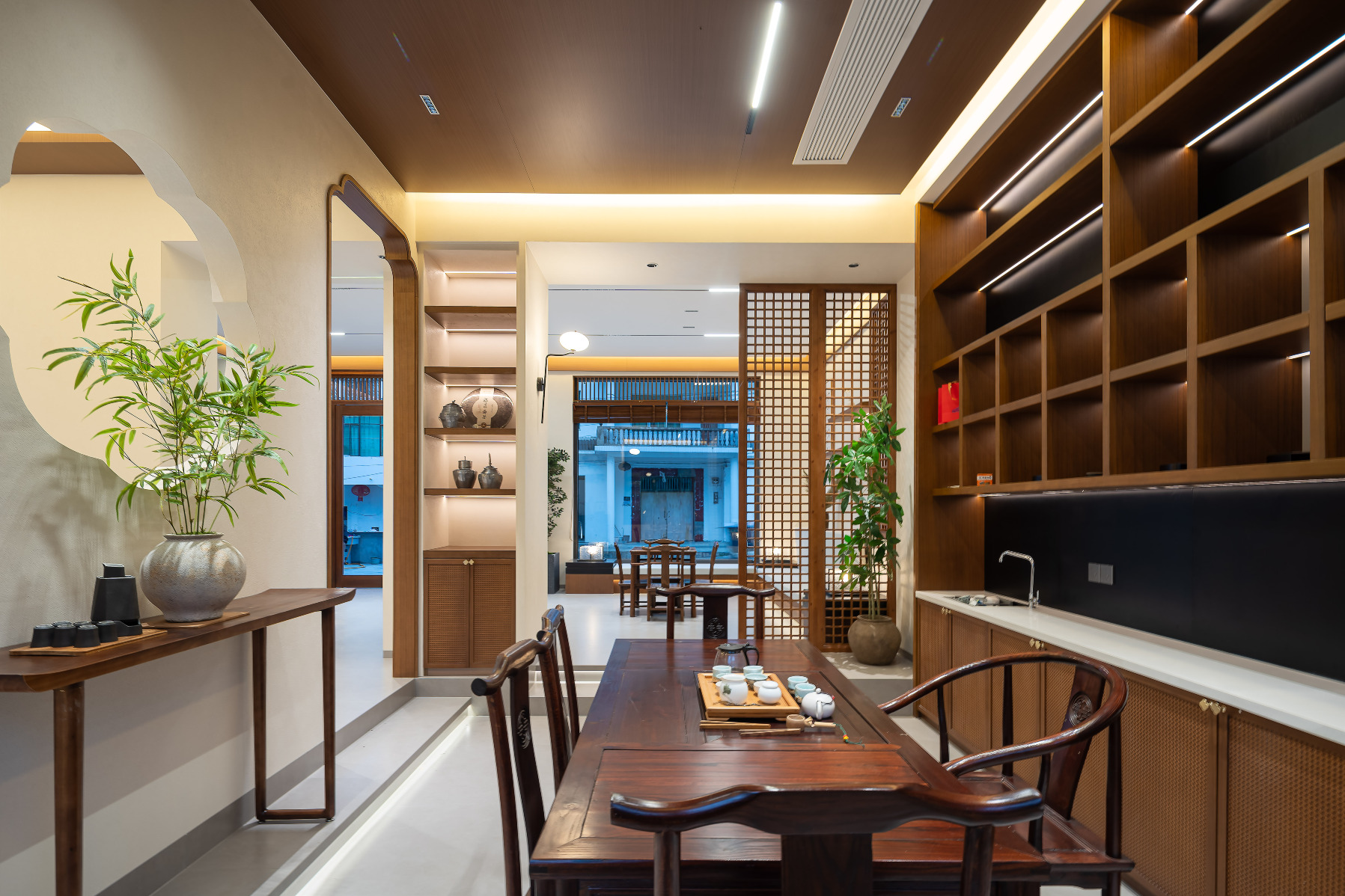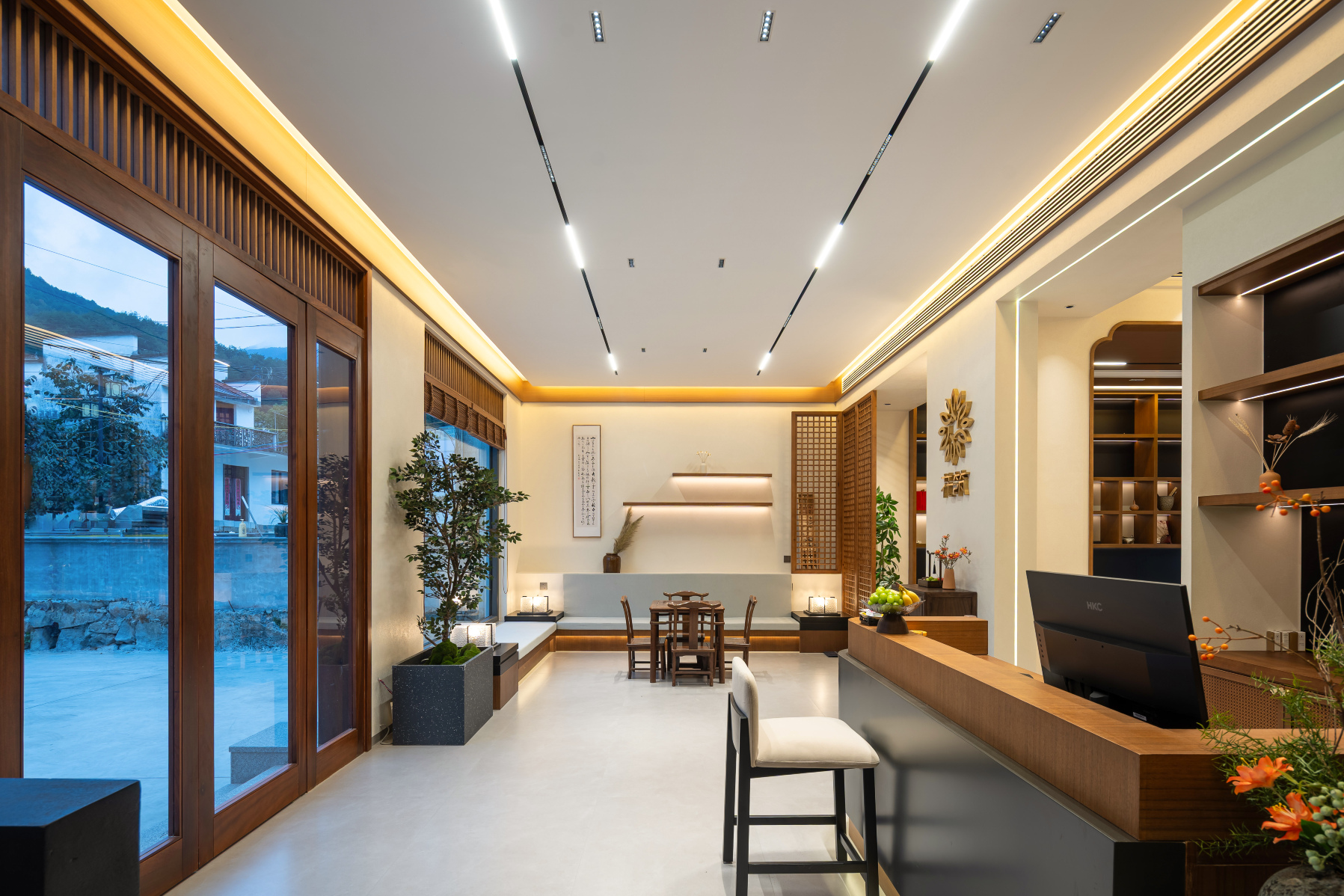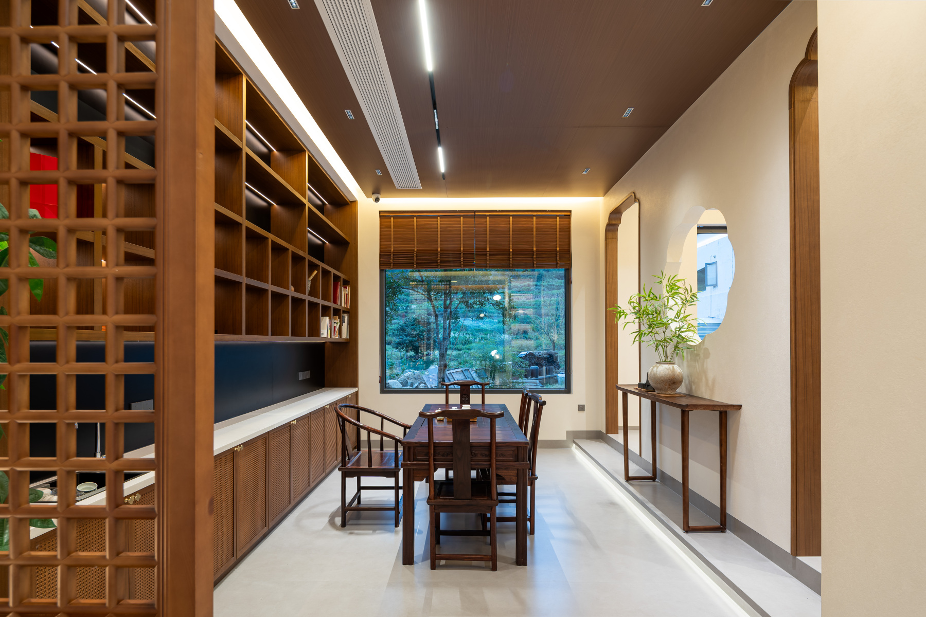 这里不刻意避世,却自然生发出一方宁静。客房以素简为基调,木质格栅勾勒出光影的边界,宋式家具静默如诗,搭配竹绘卷轴与素朴茶器,处处流露着东方的克制与雅趣。居於此处,空间营造旨在让窗化为画框,将山景收束为境,无论是“喜乐”的双床,“悦己”的大床,都以心境为名,将自然之灵引入方寸之间。你可以不出房门,在窗边泡一壶茶,看山岚起伏;也可以信步闲游,让身体与山水同呼吸。清音雅舍不只是旅途中的一个住所,更是一段可居、可游、可心的宋式生活提案——在婺源的晨昏里,找回属於东方的生活节奏。
