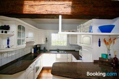 这家空调度假屋配有2间卧室、起居室、带冰箱和咖啡机的设施齐全的厨房以及1间带淋浴设施的浴室。这家度假屋也提供1间浴室。