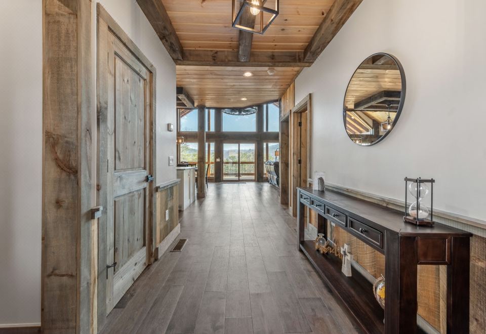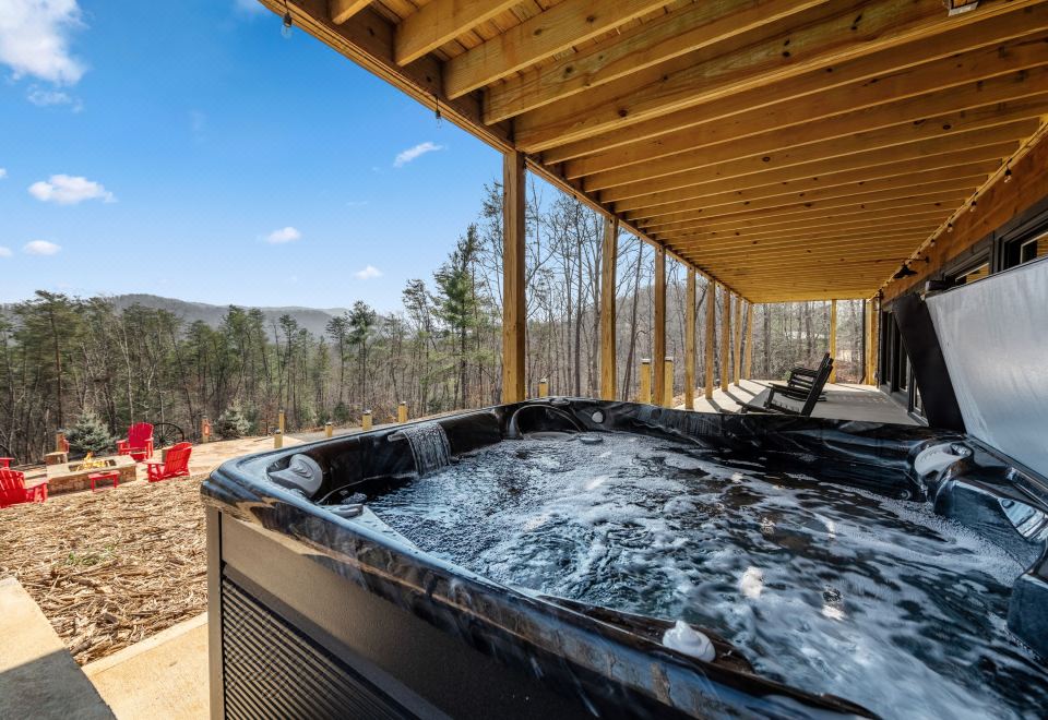 Step outside and discover our inviting decks, offering an array of additional pleasures. Snuggle up next to the crackling wood-burning fireplace as you unwind on our soft sectional seating or indulge in your preferred entertainment with the outdoor 60” TV. Want to soak up the scenery? Our rocking chairs offer the perfect perch, while the gas grill promises mouthwatering outdoor feasts. And for the ultimate relaxation, drift into the bubbling embrace of our hot tub while escaping into the glorious mountain view!