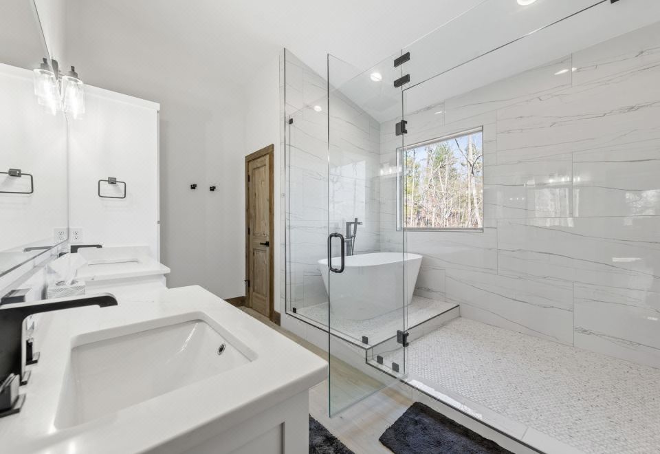 Free standing tub inside enclosed multi-head shower area