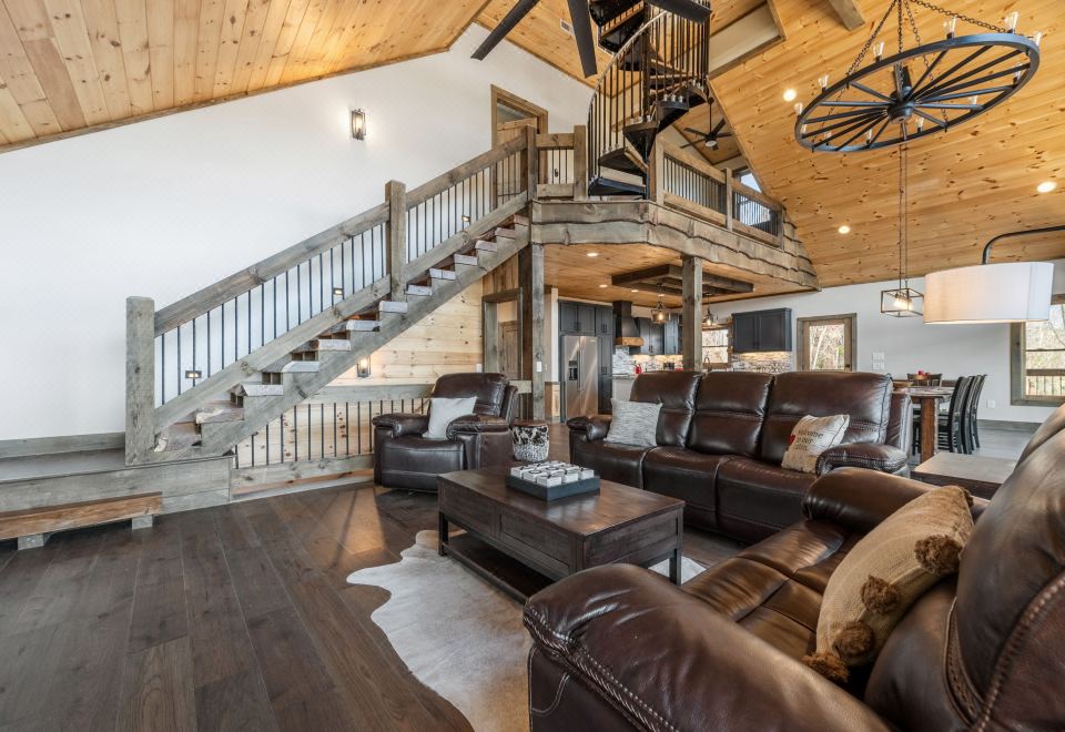 As you ascend upstairs, prepare to be enchanted by the primary king bedroom suite. With its own electric fireplace, TV, and private bathroom boasting a freestanding tub within the multi-head shower area and a double vanity, it's a sanctuary of serenity. Step out onto the private balcony and let your gaze drink in the breathtaking views while you relax in the comfort of our lounge chairs. Exploring the spiral staircase will lead you to the grandeur of nature through our property's crow nest feature, offering a tranquil ambiance. Find quiet contentment in the interior bench seating or unwind on the balcony, furnished with high-top chairs and a table where you can sit amongst the clouds for hours!