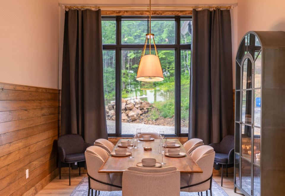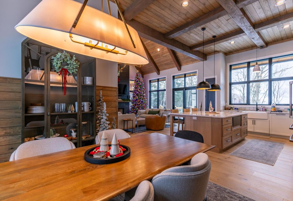 Next to the kitchen, the dining area is set with a table for six but up to eight, offering an ideal spot for sharing meals with family and friends. The open layout ensures you can engage with your loved ones while cooking and dining.