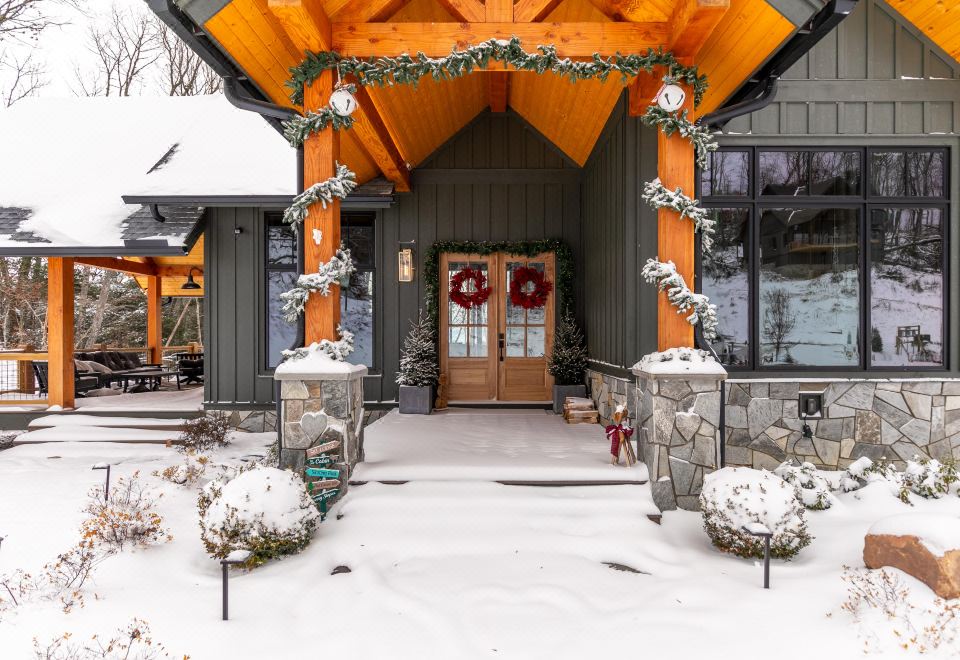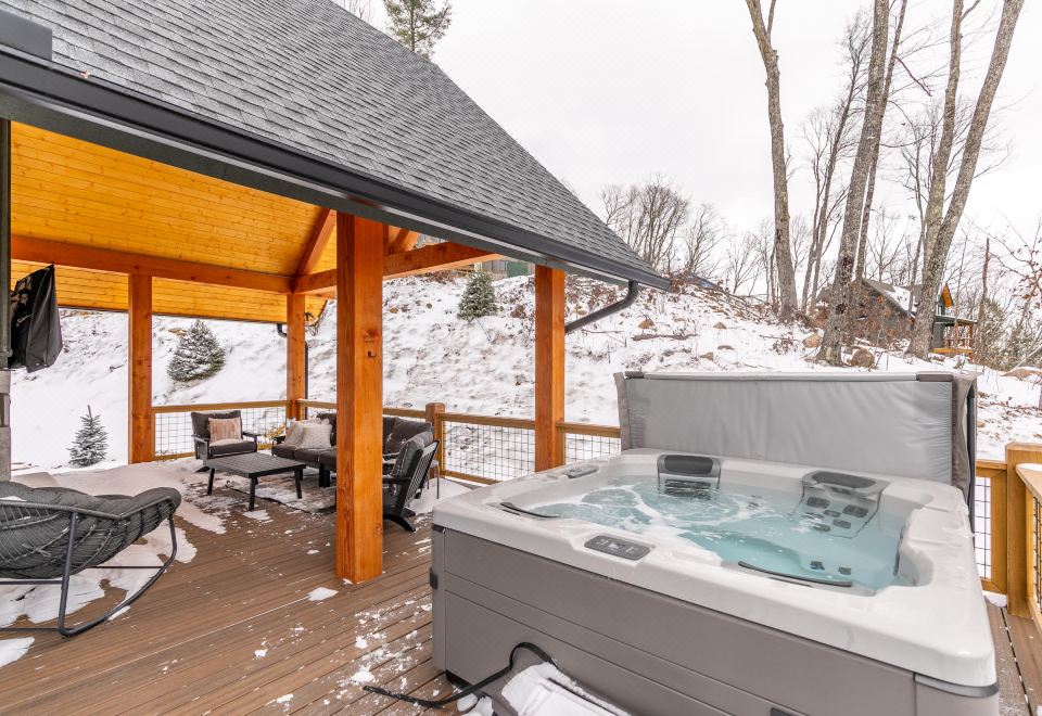 The deck is accessed from the living room and kitchen. Wrapped around the side is a covered area with seating at the outdoor gas fireplace. To complete the experience, the deck boasts a large hot tub, inviting you to relax and soak in the natural beauty that surrounds you, complete with Christmas tree views. Whether you're admiring the sunset views, enjoying the luxurious bedrooms, or sharing stories at the Eagles Nest Winery, a stay at the HeartStone Lodge offers an exceptional mountain getaway for those seeking both luxury and natural beauty.