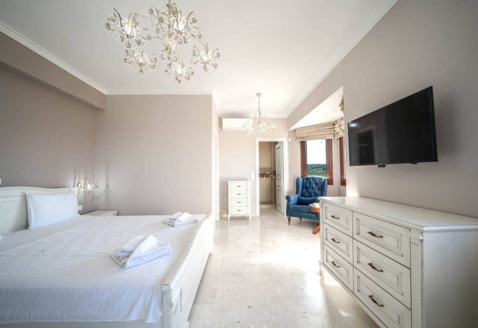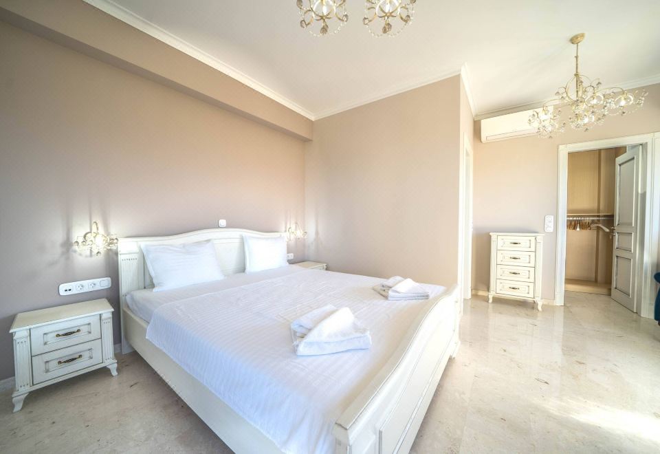 Villa Karyo has 3 comfortable bedrooms on the top floor, one master bedroom with en suite bathroom (Jacuzzi bathtub) and a separated dressing room. The second room is often used as an accommodation for children (double bed and sofa bed) and the third room as an assistance room. There is a common toilet for these two bedrooms. All of the bedrooms are with double beds and balconies.