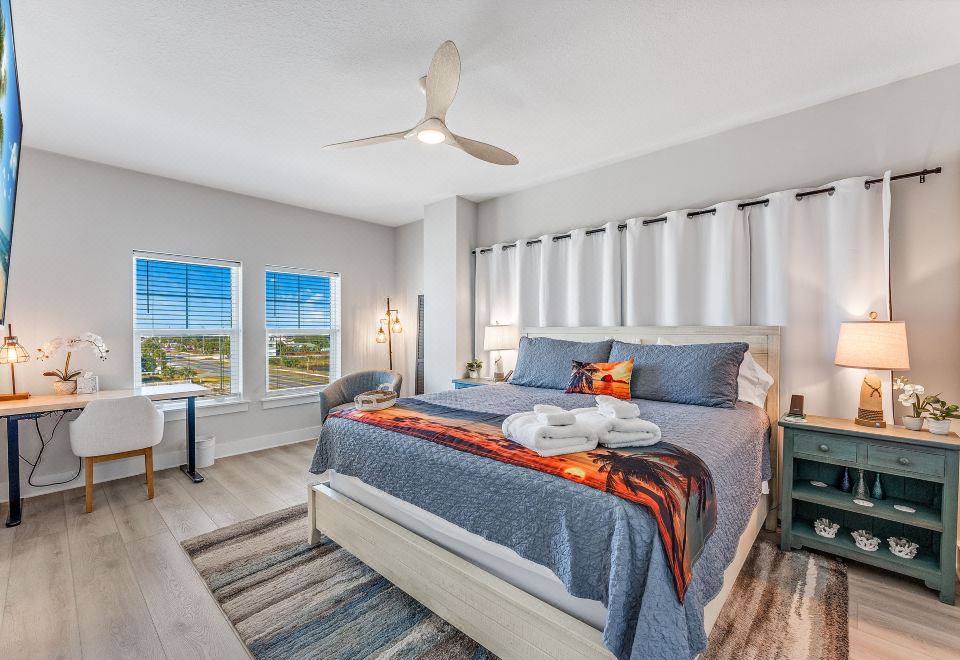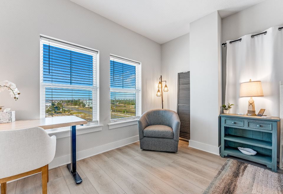? King primary suite with down-pillow-top mattress, workspace & Gulf views