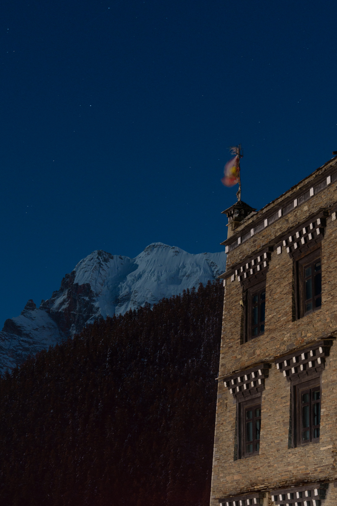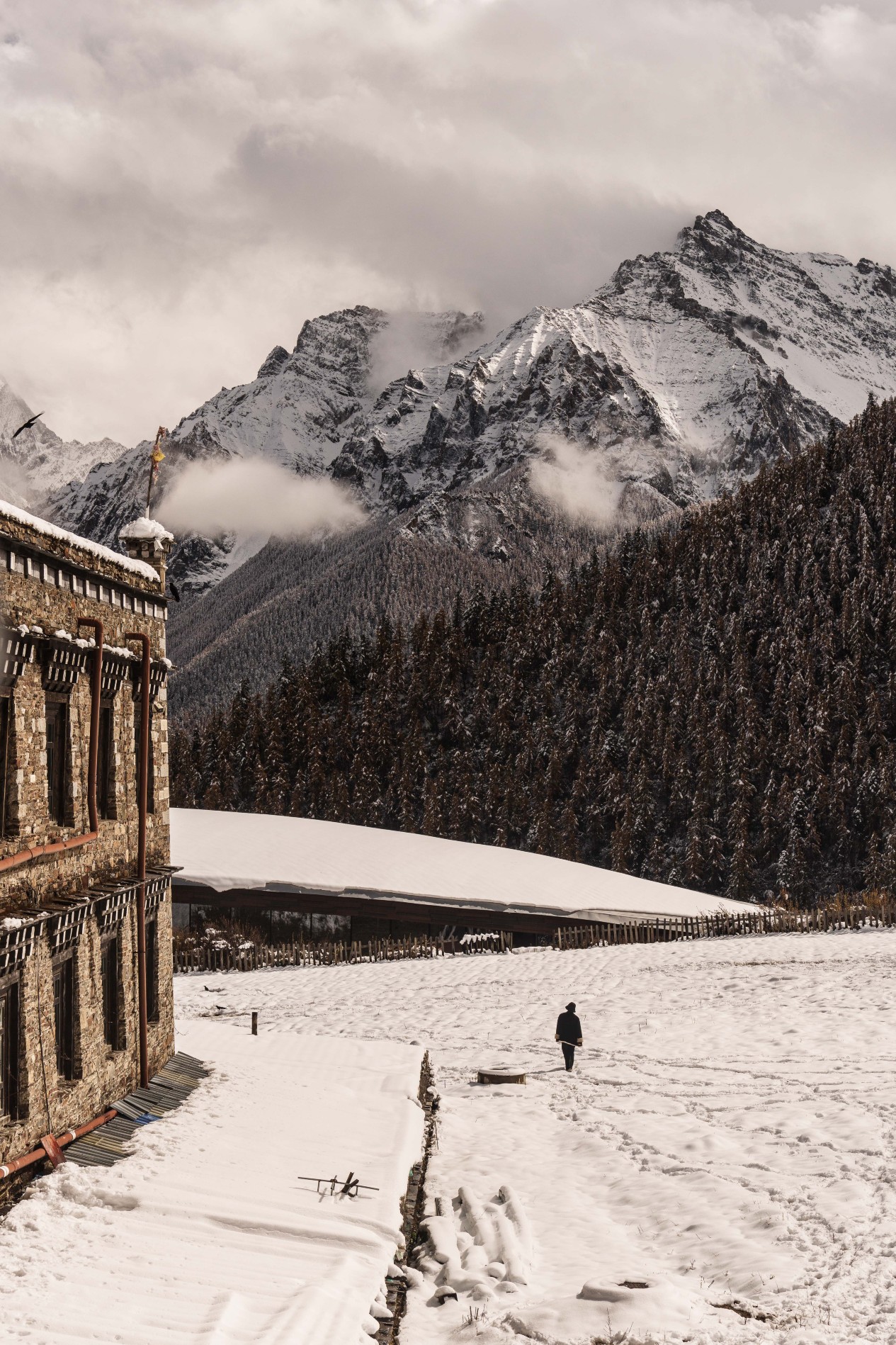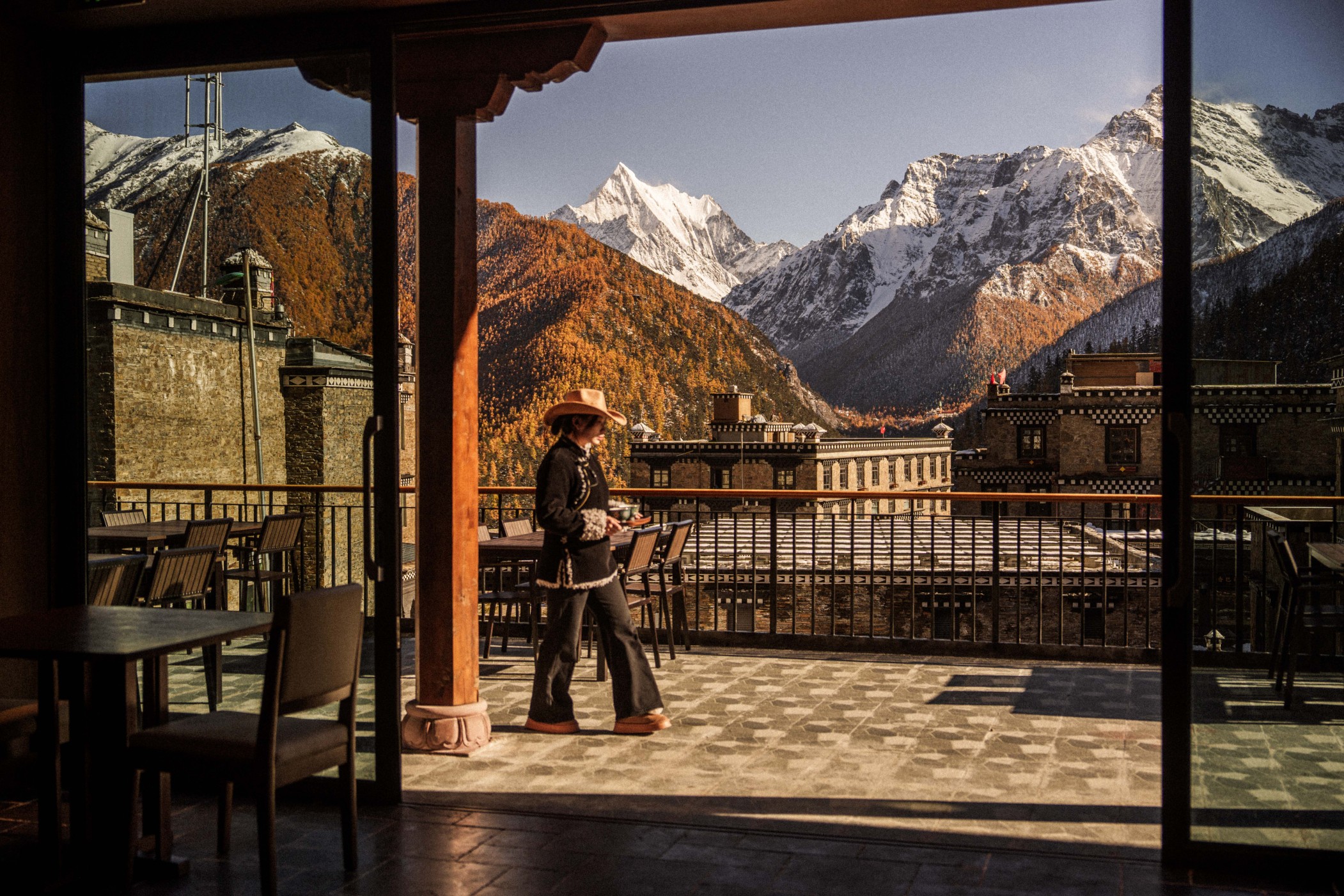 驿站依循藏地古老工法,由本地山石垒砌而成,24间房舍错落隐于雪山与草甸之间,与自然浑然一体。每间房皆窗含胜景,推窗即可将仙乃日与夏诺多吉两座神山纳入眼帘,朝迎晨光,暮送云霞。
